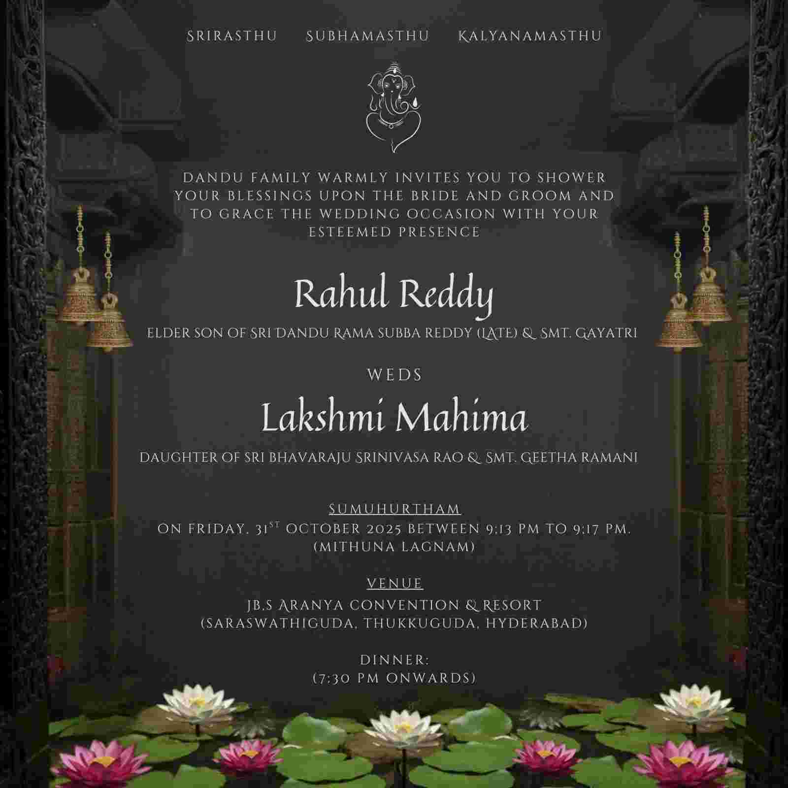 Sumuhurtham - 9.13 to 9.17 PM IST, JB.S Aranya Convention & Resorts, Hyderabad.